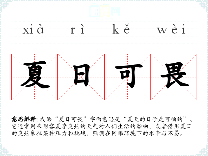 成语“夏日可畏”字面意思是“夏天的日子是可怕的”。它通常用来形容夏季炎热的天气对人们生活的影响,或者借用夏日的炎热象征某种压力和挑战,强调在困难环境下的艰辛与不易。