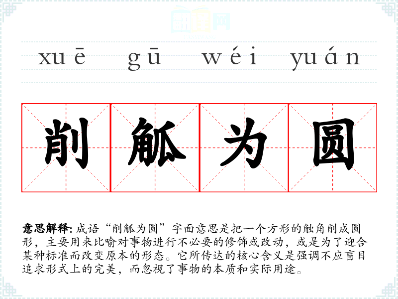 成语“削觚为圆”字面意思是把一个方形的触角削成圆形,主要用来比喻对事物进行不必要的修饰或改动,或是为了迎合某种标准而改变原本的形态。它所传达的核心含义是强调不应盲目追求形式上的完美,而忽视了事物的本质和实际用途。