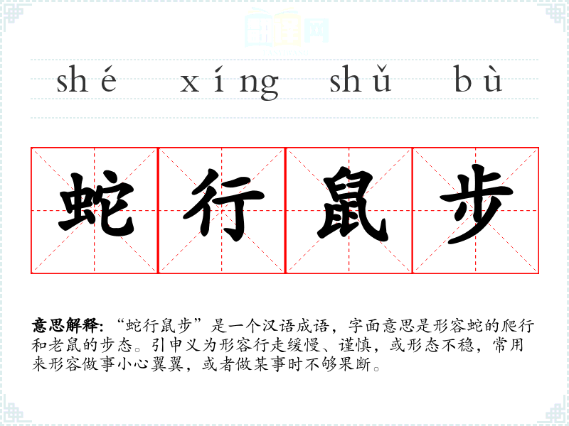 “蛇行鼠步”是一个汉语成语,字面意思是形容蛇的爬行和老鼠的步态。引申义为形容行走缓慢、谨慎,或形态不稳,常用来形容做事小心翼翼,或者做某事时不够果断。