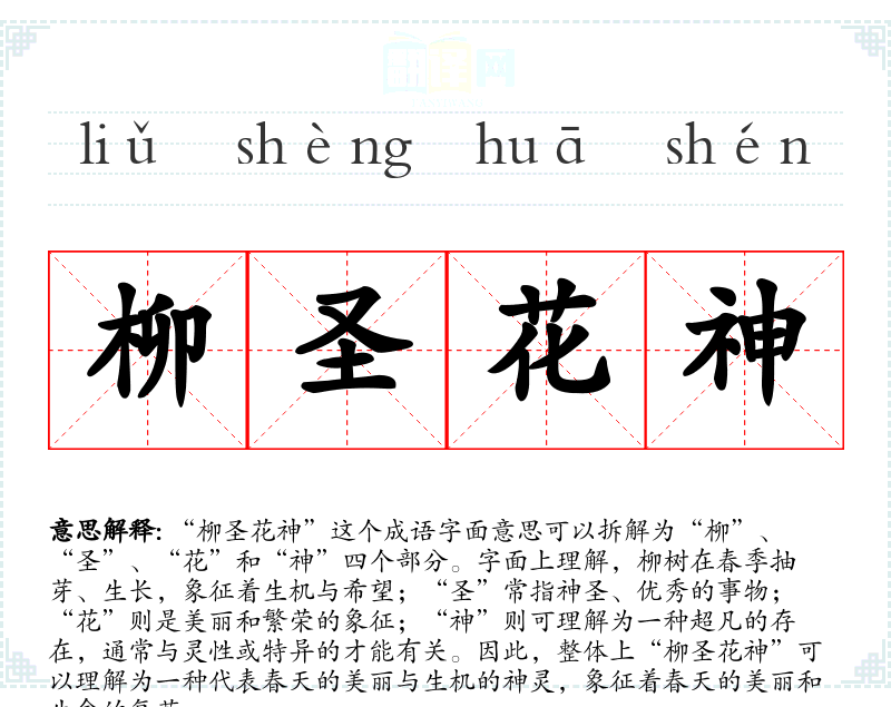 “柳圣花神”并不是一个传统的成语,而是一个较为新颖的表达,可能源于对春天的诗意描绘,或是某些文学作品中的特殊用法。它可能受到古典诗词中对春天的描写影响,如柳树、花朵等元素在古诗中常常用来表达春天的美好。