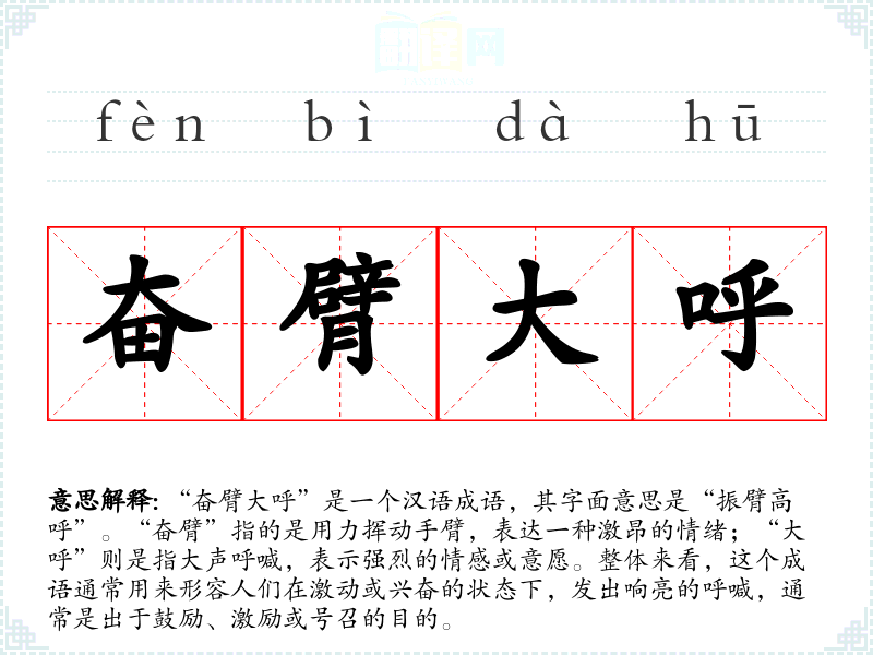 “奋臂大呼”是一个汉语成语,其字面意思是“振臂高呼”。“奋臂”指的是用力挥动手臂,表达一种激昂的情绪;“大呼”则是指大声呼喊,表示强烈的情感或意愿。整体来看,这个成语通常用来形容人们在激动或兴奋的状态下,发出响亮的呼喊,通常是出于鼓励、激励或号召的目的。