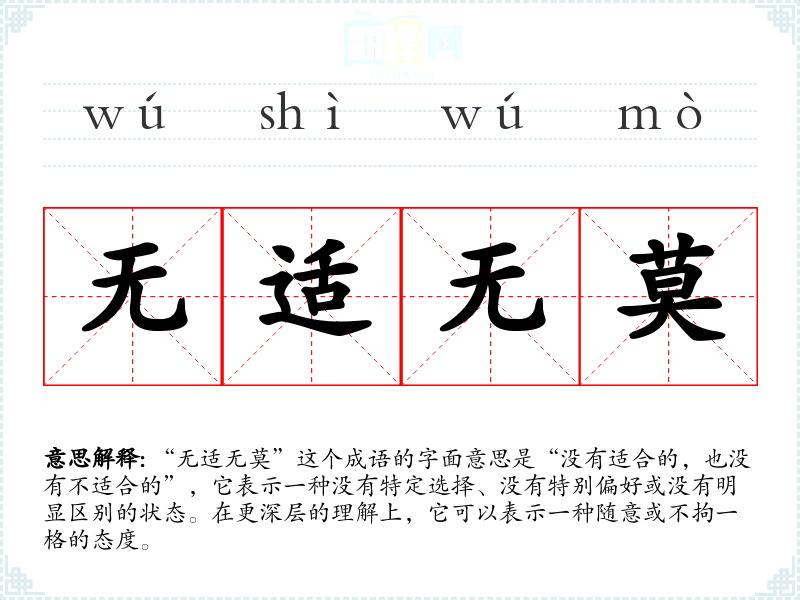 “无适无莫”这个成语的字面意思是“没有适合的,也没有不适合的”,它表示一种没有特定选择、没有特别偏好或没有明显区别的状态。在更深层的理解上,它可以表示一种随意或不拘一格的态度。