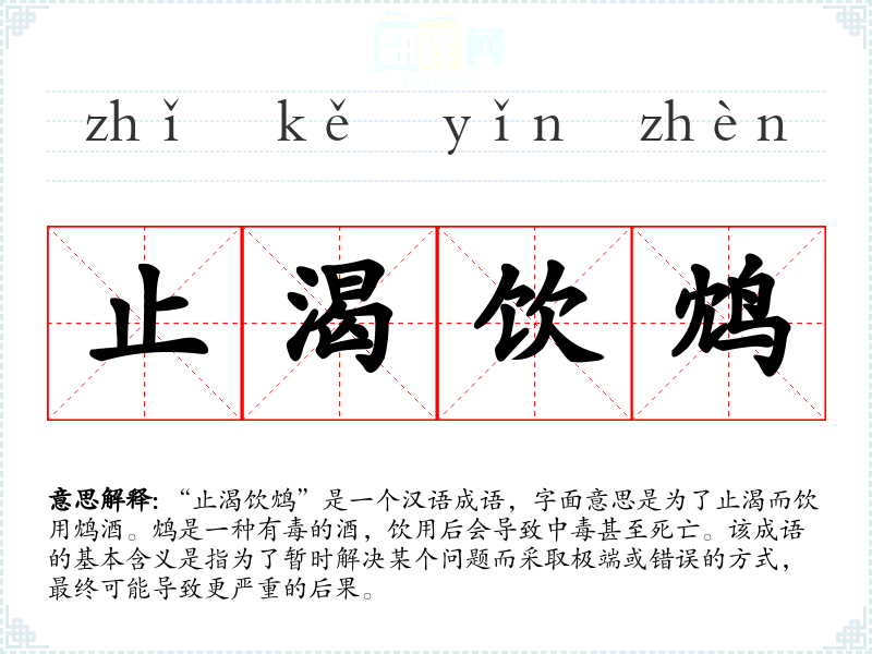 “止渴饮鸩”是一个汉语成语,字面意思是为了止渴而饮用鸩酒。鸩是一种有毒的酒,饮用后会导致中毒甚至死亡。该成语的基本含义是指为了暂时解决某个问题而采取极端或错误的方式,最终可能导致更严重的后果。