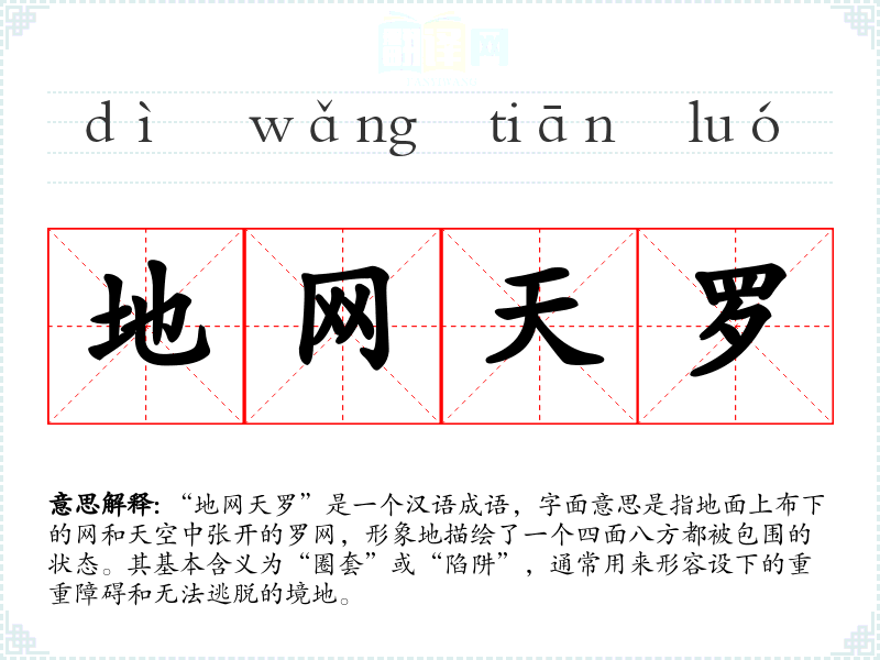 “地网天罗”是一个汉语成语,字面意思是指地面上布下的网和天空中张开的罗网,形象地描绘了一个四面八方都被包围的状态。其基本含义为“圈套”或“陷阱”,通常用来形容设下的重重障碍和无法逃脱的境地。