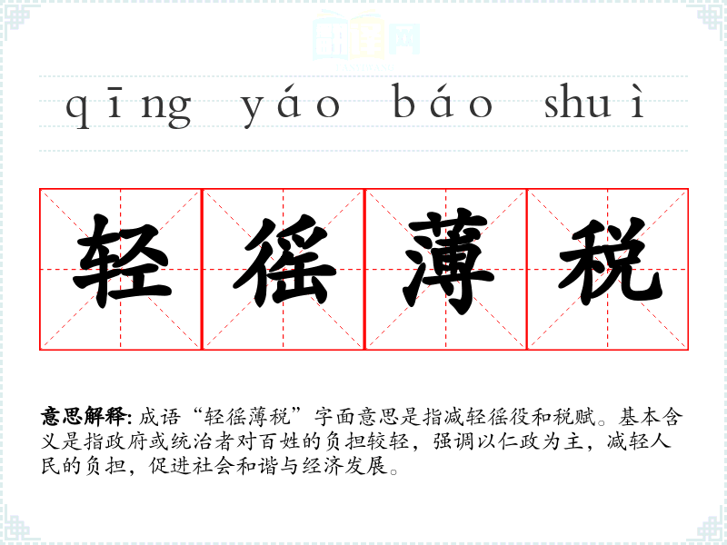 成语“轻徭*税”字面意思是指减轻徭役和税赋。基本含义是指政府或统治者对百姓的负担较轻,强调以仁政为主,减轻人民的负担,促进社会和谐与经济发展。