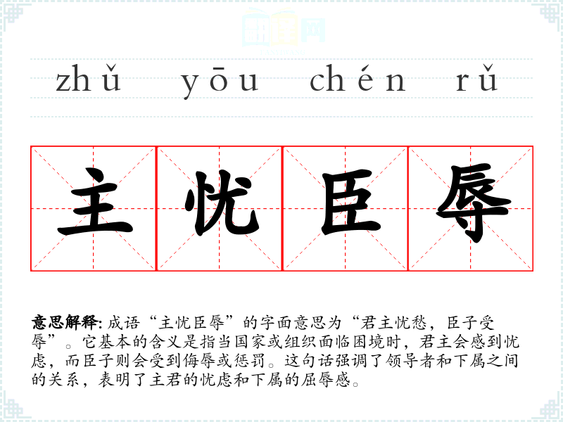 成语“主忧臣辱”的字面意思为“君主忧愁,臣子受辱”。它基本的含义是指当国家或组织面临困境时,君主会感到忧虑,而臣子则会受到侮辱或惩罚。这句话强调了领导者和下属之间的关系,表明了主君的忧虑和下属的屈辱感。