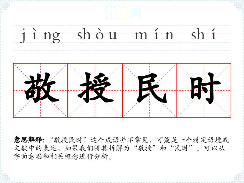“敬授民时”这个成语并不常见,可能是一个特定语境或文献中的表述。如果我们将其拆解为“敬授”和“民时”,可以从字面意思和相关概念进行分析。