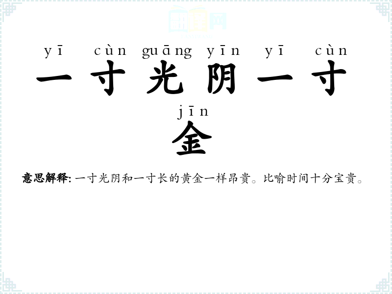 一寸光阴和一寸长的黄金一样昂贵。比喻时间十分宝贵。 |