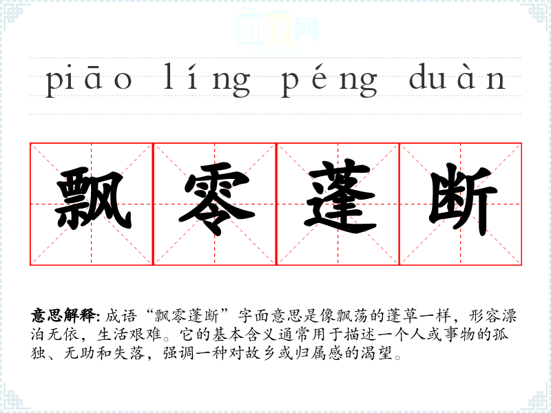 在**文化中,游子思乡的情感极为常见,许多古诗文中都提到游子在外的孤独感。现代社会中,随着人口流动加剧,许多人在大城市打拼,依然会感受到“飘零蓬断”的情绪。因此,该成语在现代社会依然具有相关性,提醒人们关注内心的归属感。
