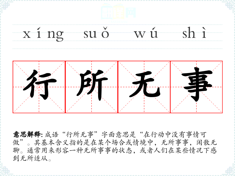 成语“行所无事”字面意思是“在行动中没有事情可做”。其基本含义指的是在某个场合或情境中,无所事事,闲散无聊。通常用来形容一种无所事事的状态,或者人们在某些情况下感到无所适从。