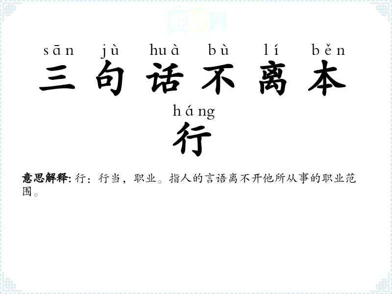 | 三句话不离本行 | 行:行当,职业。指人的言语离不开他所从事的职业范围。 |