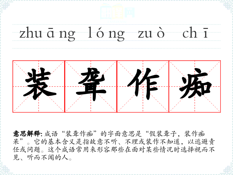 成语“装聋作痴”的字面意思是“假装聋子,装作痴呆”。它的基本含义是指故意不听、不理或装作不知道,以逃避责任或问题。这个成语常用来形容那些在面对某些情况时选择视而不见、听而不闻的人。