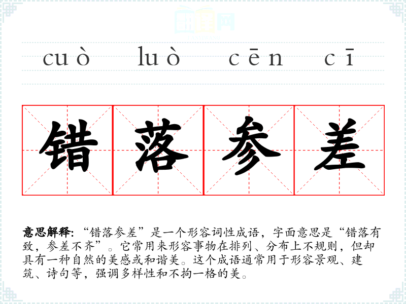 “错落参差”是一个形容词性成语,字面意思是“错落有致,参差不齐”。它常用来形容事物在排列、分布上不规则,但却具有一种自然的美感或和谐美。这个成语通常用于形容景观、建筑、诗句等,强调多样性和不拘一格的美。