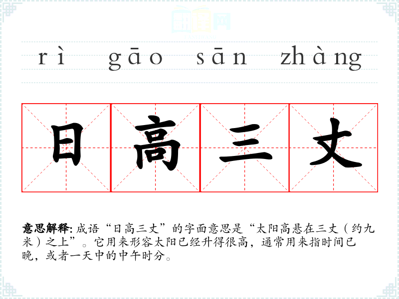 成语“日高三丈”的字面意思是“太阳高悬在三丈(约九米)之上”。它用来形容太阳已经升得很高,通常用来指时间已晚,或者一天中的中午时分。