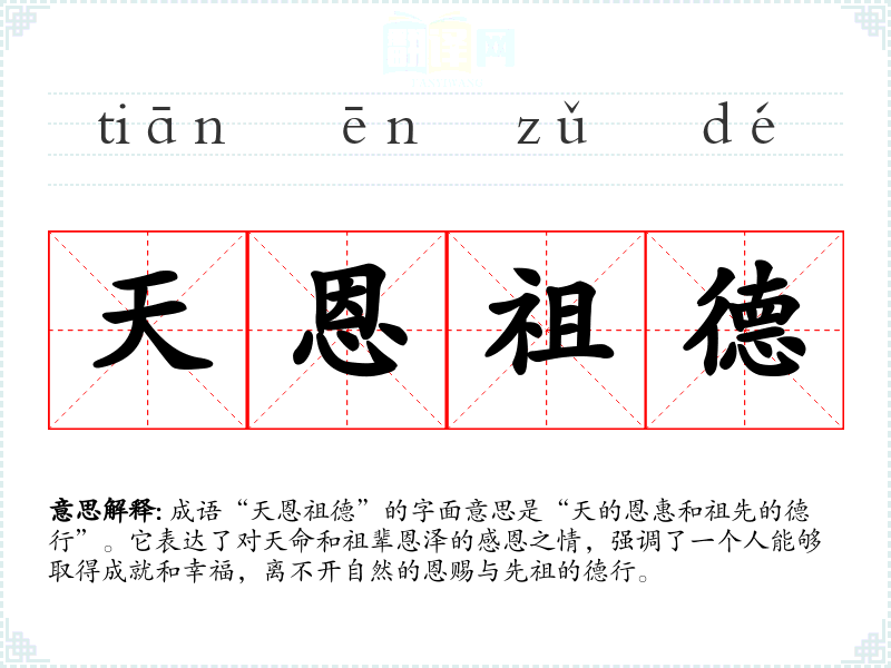 成语“天恩祖德”的字面意思是“天的恩惠和祖先的德行”。它表达了对天命和祖辈恩泽的感恩之情,强调了一个人能够取得成就和幸福,离不开自然的恩赐与先祖的德行。