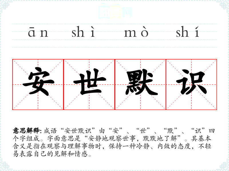 成语“安世默识”由“安”、“世”、“默”、“识”四个字组成。字面意思是“安静地观察世事,默默地了解”。其基本含义是指在观察与理解事物时,保持一种冷静、内敛的态度,不轻易表露自己的见解和情感。