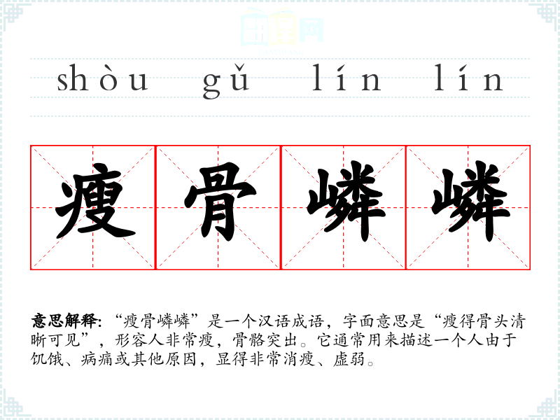 “瘦骨嶙嶙”是一个汉语成语,字面意思是“瘦得骨头清晰可见”,形容人非常瘦,骨骼突出。它通常用来描述一个人由于饥饿、病痛或其他原因,显得非常消瘦、虚弱。