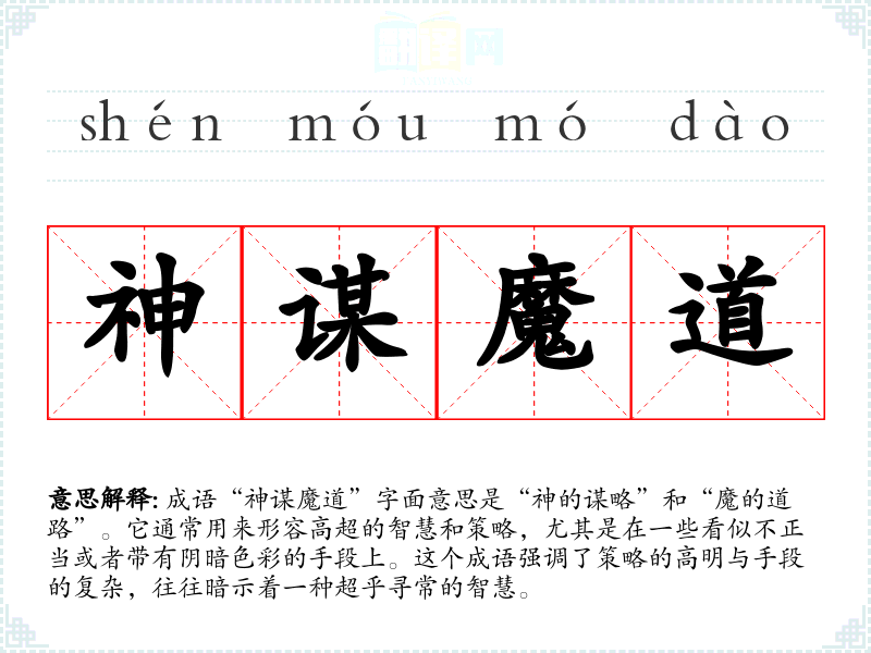 成语“神谋魔道”字面意思是“神的谋略”和“魔的道路”。它通常用来形容高超的智慧和策略,尤其是在一些看似不正当或者带有阴暗色彩的手段上。这个成语强调了策略的高明与手段的复杂,往往暗示着一种超乎寻常的智慧。