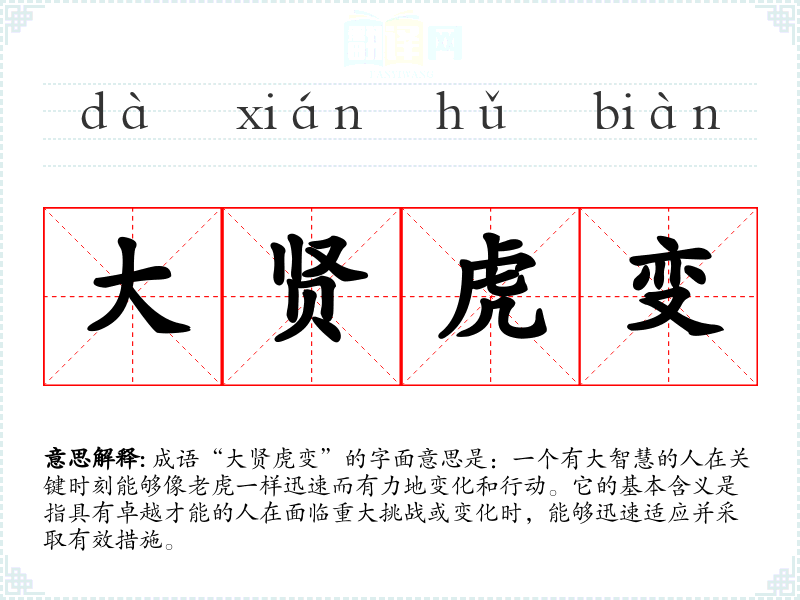 成语“大贤虎变”的字面意思是:一个有大智慧的人在关键时刻能够像**一样迅速而有力地变化和行动。它的基本含义是指具有卓越才能的人在面临重大挑战或变化时,能够迅速适应并采取有效措施。