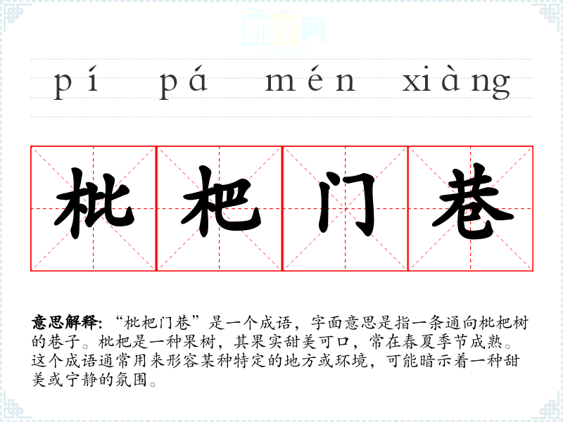 “枇杷门巷”是一个成语,字面意思是指一条通向枇杷树的巷子。枇杷是一种果树,其果实甜美可口,常在春夏季节成熟。这个成语通常用来形容某种特定的地方或环境,可能暗示着一种甜美或宁静的氛围。