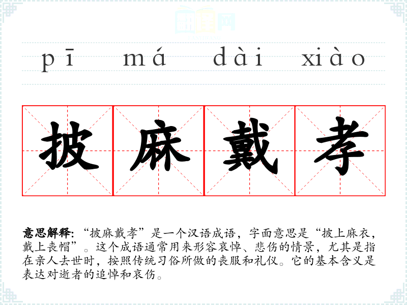 | 披麻戴孝 | 指长辈去世,子孙身披麻布服,头上戴白,表示哀悼。 |