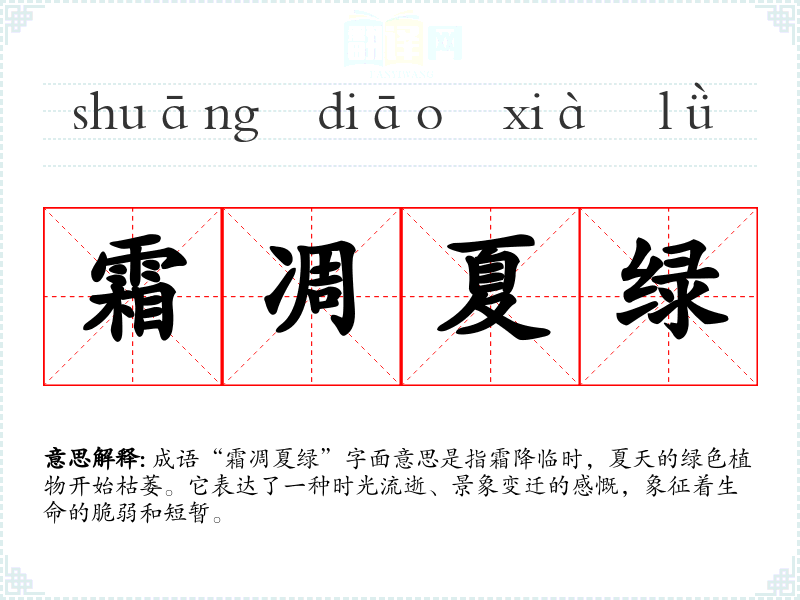 成语“霜凋夏绿”字面意思是指霜降临时,夏天的绿色植物开始枯萎。它表达了一种时光流逝、景象变迁的感慨,象征着生命的脆弱和短暂。