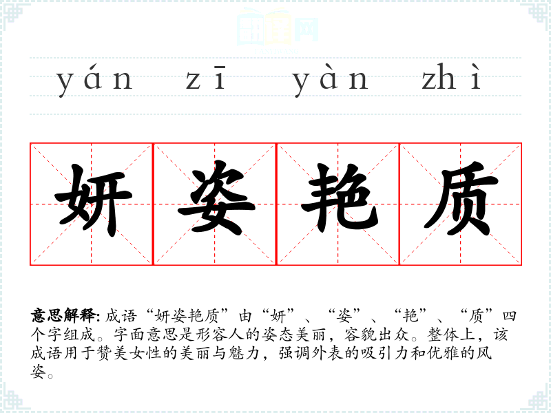 成语“妍姿艳质”由“妍”、“姿”、“艳”、“质”四个字组成。字面意思是形容人的姿态美丽,容貌出众。整体上,该成语用于赞美女性的美丽与魅力,强调外表的吸引力和优雅的风姿。