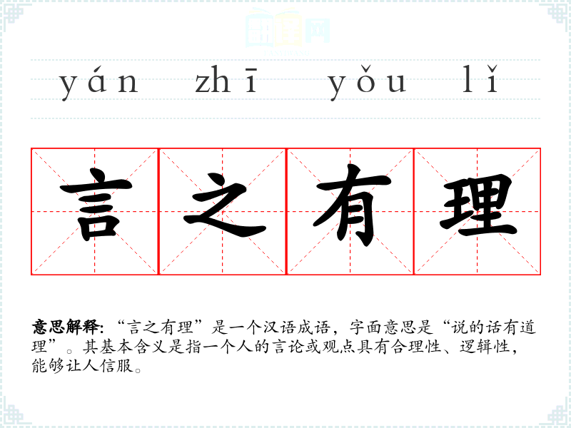 “言之有理”是一个汉语成语,字面意思是“说的话有道理”。其基本含义是指一个人的言论或观点具有合理性、逻辑性,能够让人信服。