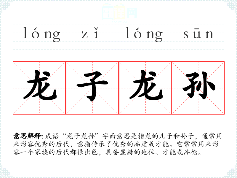 成语“龙子龙孙”字面意思是指龙的儿子和孙子,通常用来形容优秀的后代,意指传承了优秀的品质或才能。它常常用来形容一个家族的后代都很出色,具备显赫的地位、才能或品德。