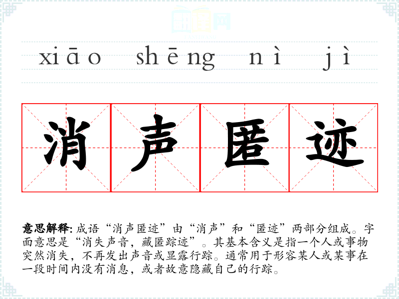 成语“消声匿迹”由“消声”和“匿迹”两部分组成。字面意思是“消失声音,藏匿踪迹”。其基本含义是指一个人或事物突然消失,不再发出声音或显露行踪。通常用于形容某人或某事在一段时间内没有消息,或者故意隐藏自己的行踪。
