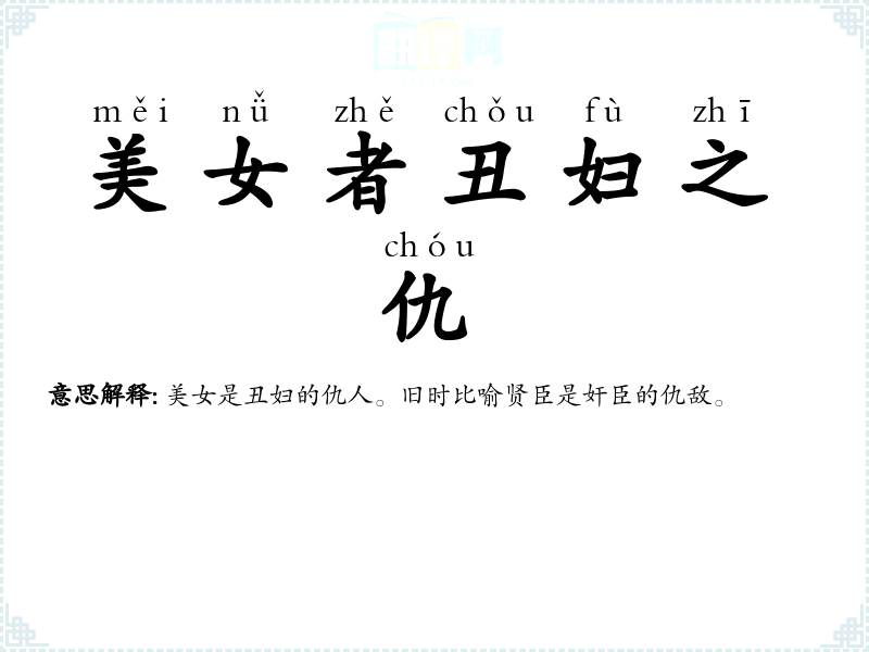 美女是丑妇的仇人。旧时比喻贤臣是奸臣的仇敌。 |
