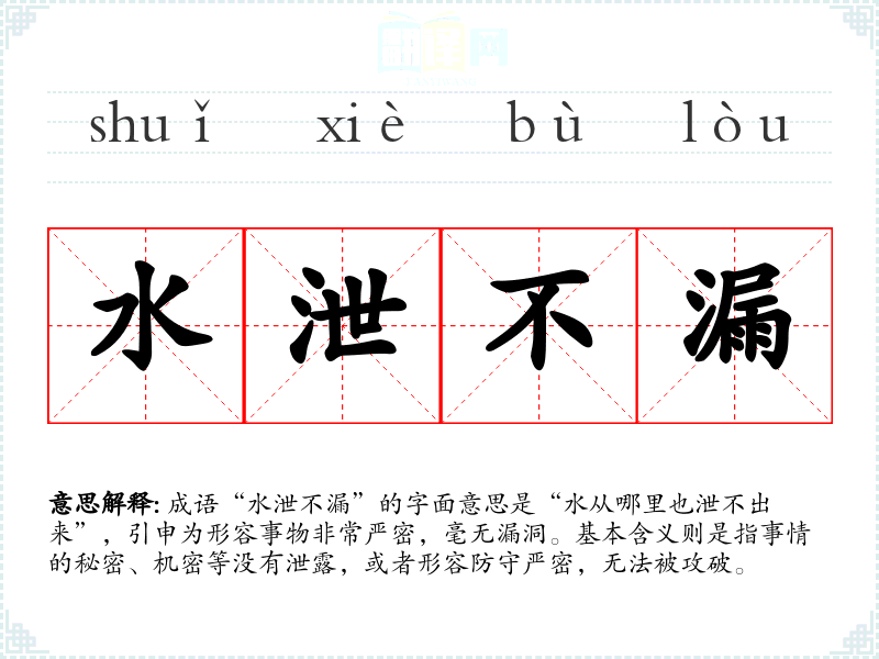 成语“水泄不漏”的字面意思是“水从哪里也泄不出来”,引申为形容事物非常严密,毫无漏洞。基本含义则是指事情的秘密、机密等没有泄露,或者形容防守严密,无法被攻破。