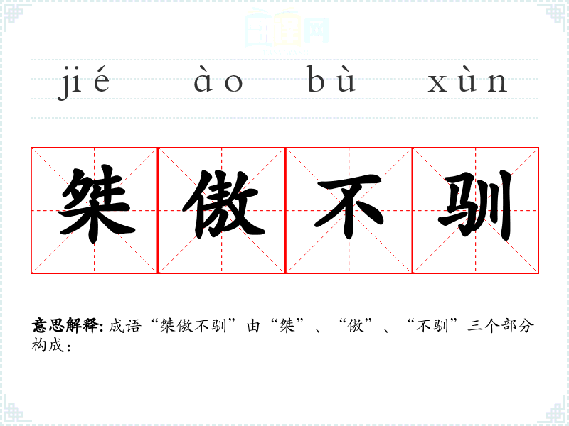 成语“桀傲不驯”由“桀”、“傲”、“不驯”三个部分构成: