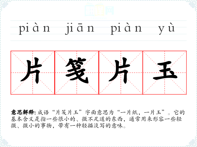 成语“片笺片玉”字面意思为“一片纸,一片玉”。它的基本含义是指一些很小的、微不足道的东西,通常用来形容一些轻微、微小的事物,带有一种轻描淡写的意味。