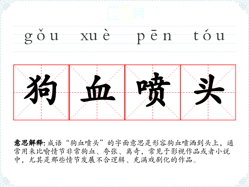 成语“狗血喷头”的字面意思是形容狗血喷洒到头上,通常用来比喻情节非常狗血、夸张、离奇,常见于影视作品或者小说中,尤其是那些情节发展不合逻辑、充满戏剧化的作品。