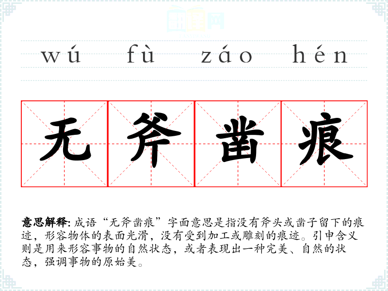 “无斧凿痕”源于古代的工艺和建筑,尤其是在石雕和木工方面。这个成语的具体出处较为模糊,但可以理解为一种对自然状态和原始美的赞美,体现了古人对工艺精致和自然风貌的追求。在某些文献中,可能会提到与古代雕刻艺术相关的作品,反映出人们对未被人工加工的事物的欣赏。