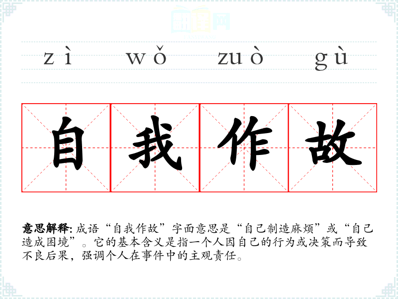 成语“自我作故”字面意思是“自己制造麻烦”或“自己造成困境”。它的基本含义是指一个人因自己的行为或决策而导致不良后果,强调个人在**中的主观责任。