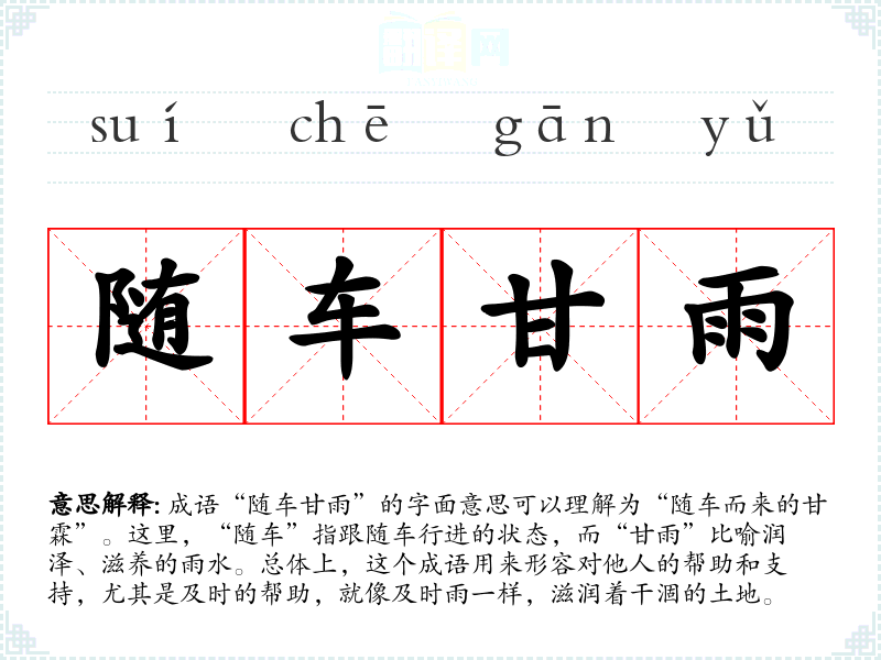 成语“随车甘雨”的字面意思可以理解为“随车而来的甘霖”。这里,“随车”指跟随车行进的状态,而“甘雨”比喻润泽、滋养的雨水。总体上,这个成语用来形容对他人的帮助和支持,尤其是及时的帮助,就像及时雨一样,滋润着干涸的土地。