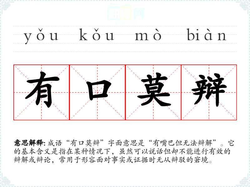成语“有口莫辩”字面意思是“有嘴巴但无法辩解”。它的基本含义是指在某种情况下,虽然可以说话但却不能进行有效的辩解或辩论,常用于形容面对事实或证据时无从辩驳的窘境。