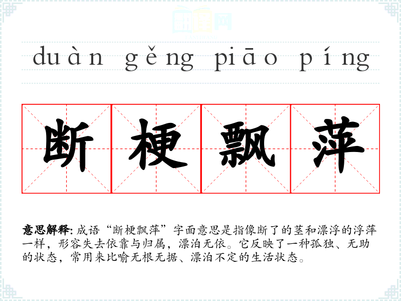 成语“断梗飘萍”字面意思是指像断了的茎和漂浮的浮萍一样,形容失去依靠与归属,漂泊无依。它反映了一种孤独、无助的状态,常用来比喻无根无据、漂泊不定的生活状态。