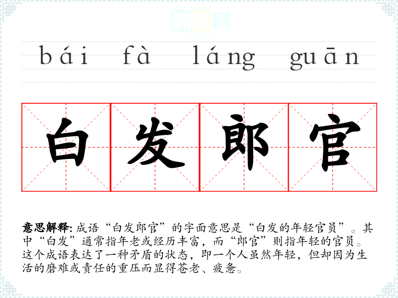“白发郎官”的具体出处并不明确,但可以追溯到古代文学中对青年官员与年老形象的对比。在许多古代诗词中,常常用“白发”象征经历与沧桑,而“郎官”则是年轻人的代表。这个成语可能源于对年轻官员在职场上承受巨大压力的描绘。