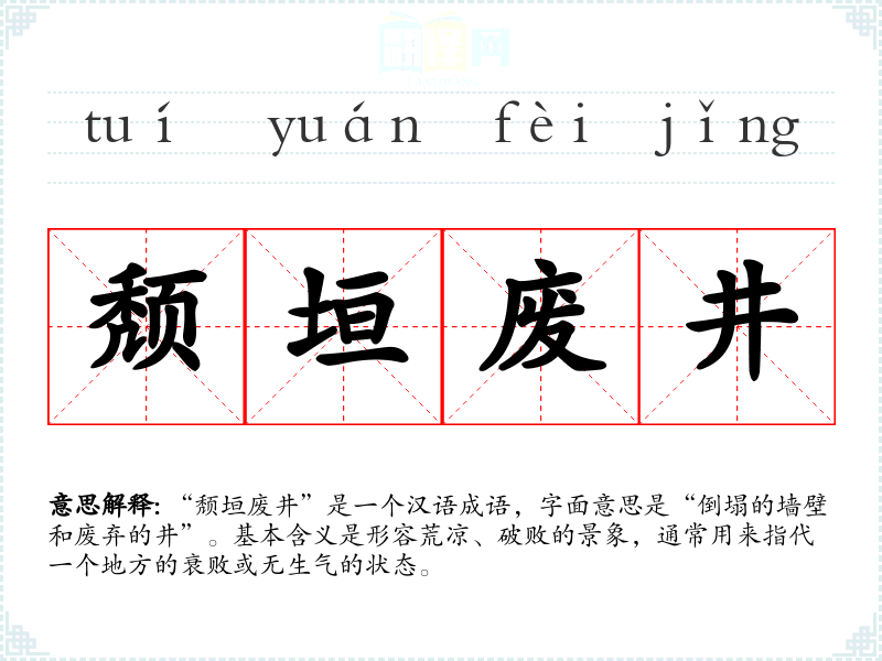 | 颓垣败井 | 犹颓垣废井。形容荒凉破败的景象。 |