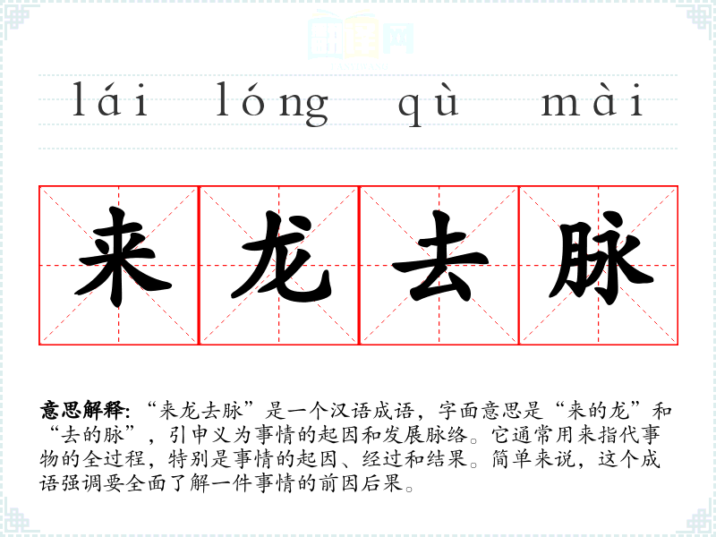 “来龙去脉”是一个汉语成语,字面意思是“来的龙”和“去的脉”,引申义为事情的起因和发展脉络。它通常用来指代事物的全过程,特别是事情的起因、经过和结果。简单来说,这个成语强调要全面了解一件事情的前因后果。