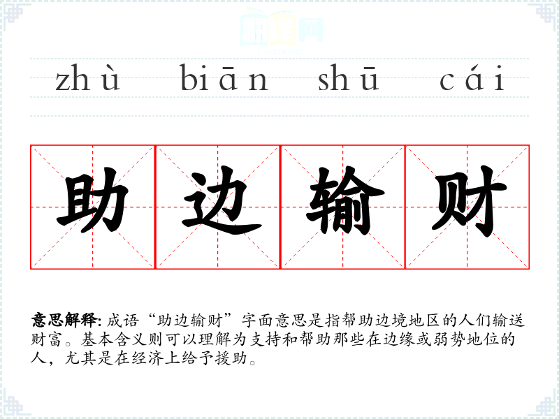 成语“助边输财”字面意思是指帮助边境地区的人们输送财富。基本含义则可以理解为支持和帮助那些在边缘或弱势地位的人,尤其是在经济上给予援助。