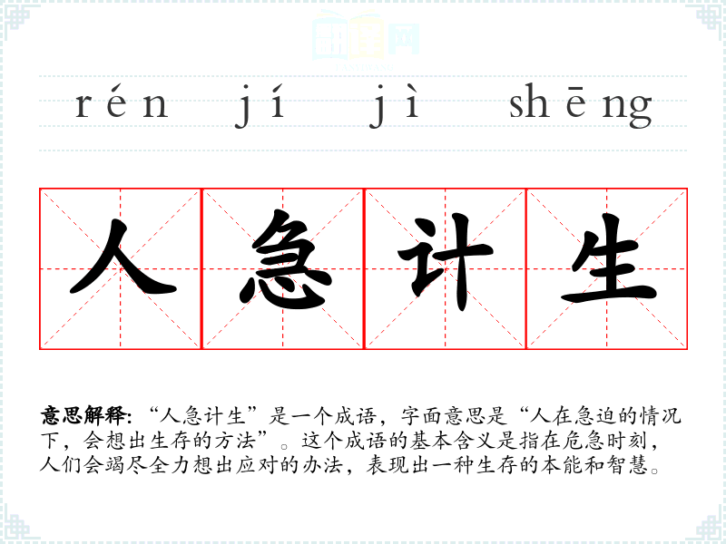 “人急计生”是一个成语,字面意思是“人在急迫的情况下,会想出生存的方法”。这个成语的基本含义是指在危急时刻,人们会竭尽全力想出应对的办法,表现出一种生存的本能和智慧。