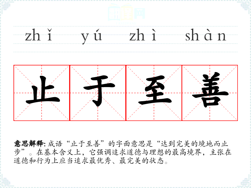在传统**文化中,止于至善体现了一种追求完美和道德自律的价值观。现代社会中,这一成语依然适用,尤其在自我提升、职业发展和道德教育方面,强调不断进步和追求更高标准的重要性。