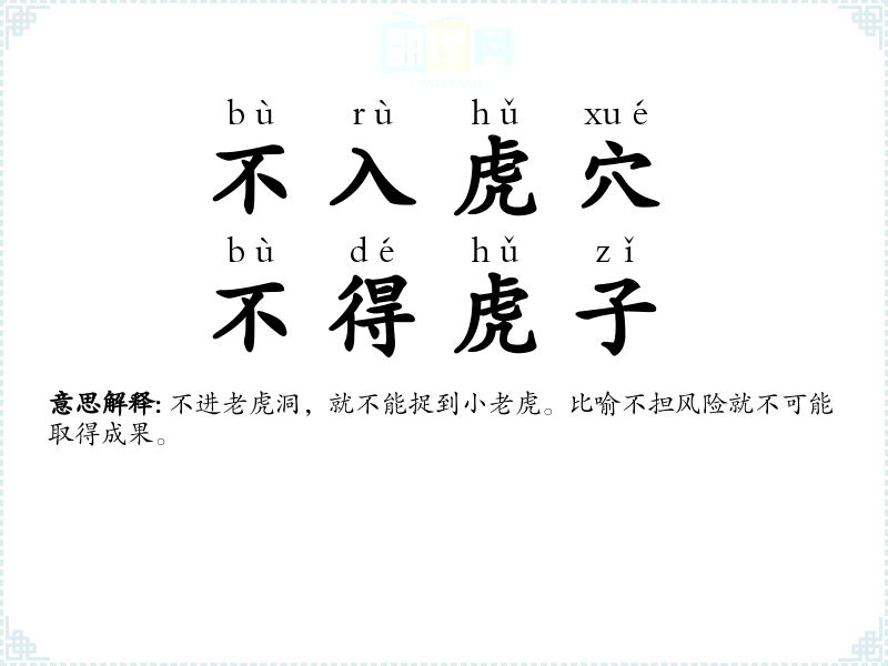 不进老虎洞,就捉不到小老虎。比喻不冒险进入危险境地,就不能取得必须的成果。同“不入虎穴,焉得虎子”。 |