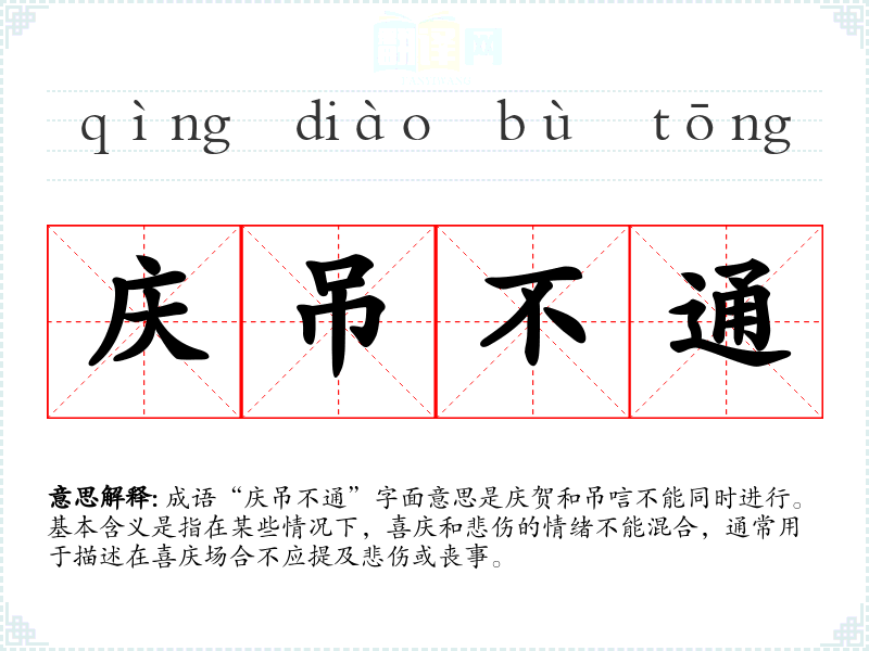成语“庆吊不通”字面意思是庆贺和吊唁不能同时进行。基本含义是指在某些情况下,喜庆和悲伤的情绪不能混合,通常用于描述在喜庆场合不应提及悲伤或丧事。