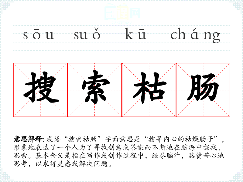 成语“搜索枯肠”字面意思是“搜寻内心的枯燥肠子”,形象地表达了一个人为了寻找创意或答案而不断地在脑海中翻找、思索。基本含义是指在写作或创作过程中,绞尽脑汁,煞费苦心地思考,以求得灵感或解决问题。
