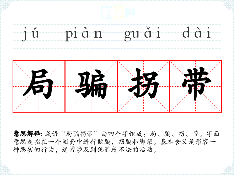 成语“局骗拐带”由四个字组成:局、骗、拐、带。字面意思是指在一个圈套中进行欺骗,拐骗和绑架。基本含义是形容一种恶劣的行为,通常涉及到犯罪或不法的活动。